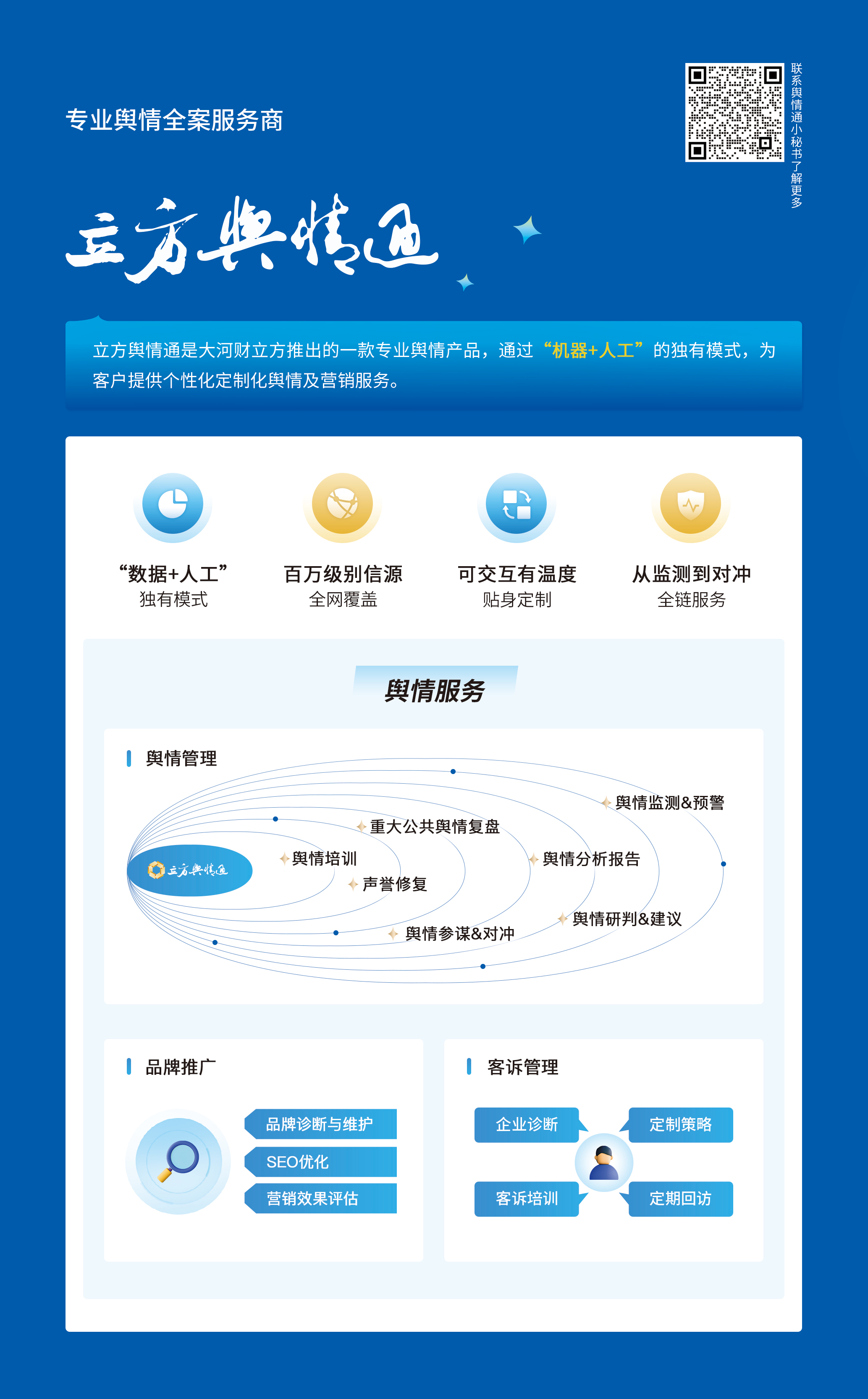 立方舆情通是大河财立方推出的一款专业舆情产品,通过“机器+人工”的独有模式,为客户提供个性化定制化舆情及营销服务。